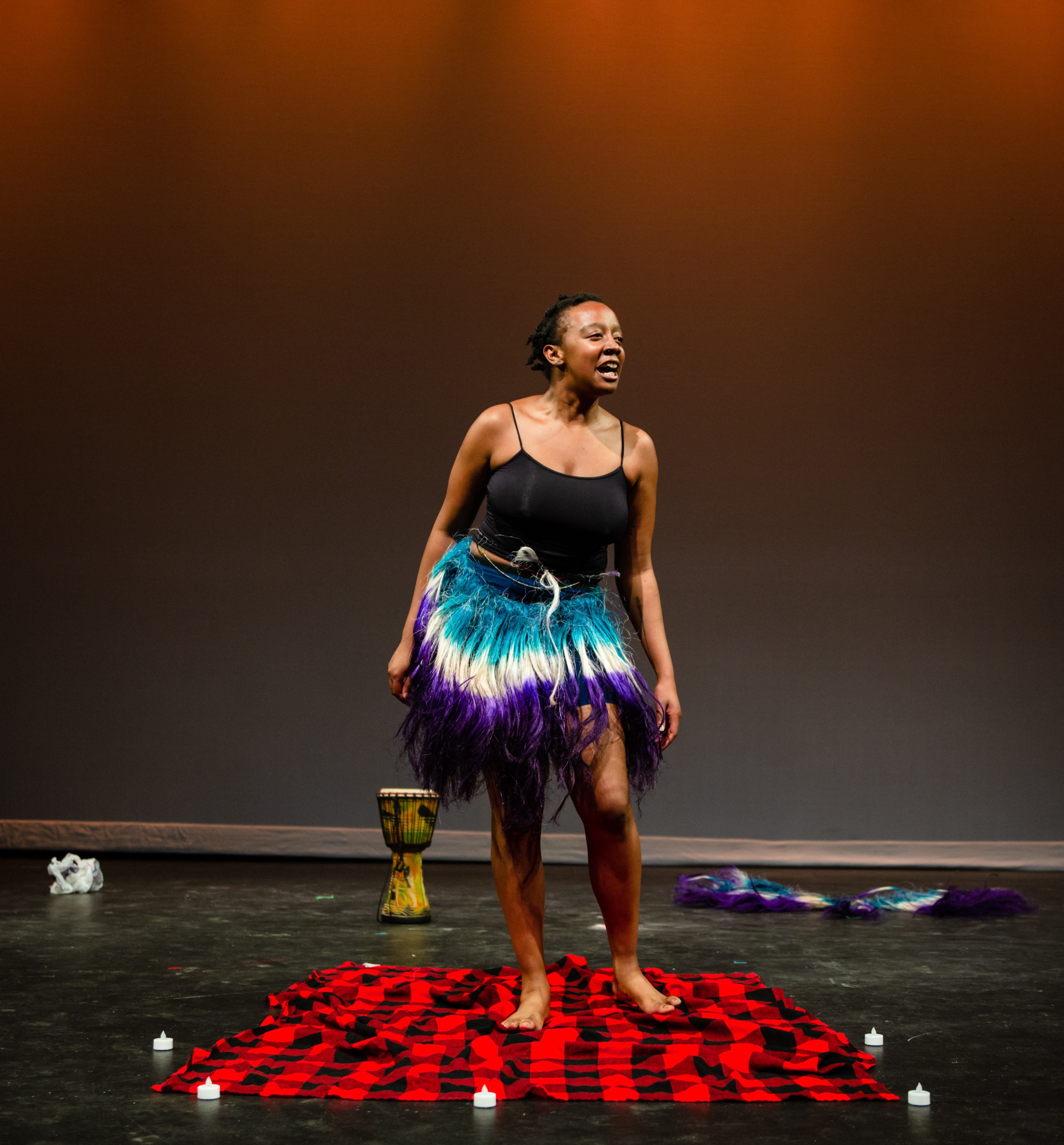 For their Solo Performance thesis at Barnard College (CC'19), Nerima Makhondo (fka Rũgũrũ Karira) performed a piece entitled 'Four women, if you know you know'(an Ode to Nina Simone). This 15 minute performance explored how Black Women have engaged with the freedom movement in contemporary African political conversations. Under the guidance of Prof. Kyle deCamp, Nerima weaved a piece that highlighted two contemporary African women directly opposed their governments and faced violent responses; Stella Nyanzi (Uganda) and Joana Mamombe (Zimbabwe). Additionally, they used three identified Womanist virtues; Unshouted Courage, Quiet Grace and Invisible Dignity to create the characters and added an additional virtue, Radical Rudeness to create 4 characters. The piece also uses collected excerpts from Alexis Pualine Gumbs' poetry, Stella Nyanzi's poetry, Ntozake Shange's book Sassafrass, Cypress & Indigo, Joana Mamombe's speeches and Banyala war songs (from my Auntie Bertha) to weave an intricate narrative spotlighting black women's encounters with political violence and further than that, through integrated spellwork, give instructions for healing. "I want to hold a space both spiritually and physically using my body to the souls of black women that I have encountered in one way or another and those that I have not to celebrate them. Within my piece, I want to bring to the fore the spiritual and physical tactics that have been applied to preserve our existence and ensure survival." - Rũgũrũ Karira CC'19 In the performance, Nerima uses performance techniques such as their drumming, costume changes, spell work, folk dancing, stage demarcation among other tools to set 'conditions' for their four characters in order to differentiate the virtues and tell the story. CW: partial nudity from min. 14:20